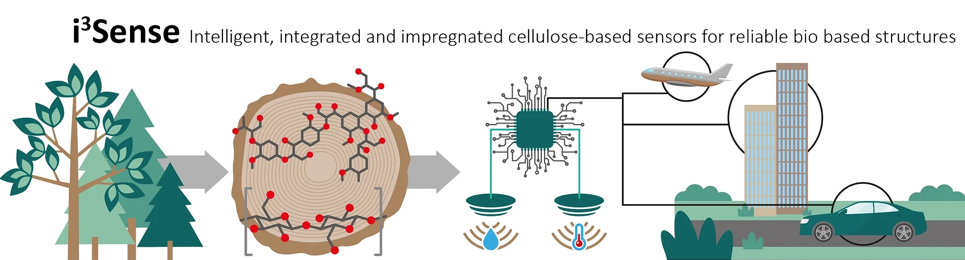 The COMET Module i³Sense establishes the scientific foundation for a revolutionary enhancement in the functionality, durability, and reliability of structural components made from wood and natural fibers. The anticipated performance improvement will be achieved through imperceptible, seamlessly integrated sensing of crucial parameters related to the production and lifespan of bio-based structural components, such as humidity, mechanical strain, and temperature. Specifically, humidity holds critical importance for the performance and reliability of any lignocellulosic material. Beyond a certain threshold, elevated humidity significantly hinders the functionality of lignocellulosic structural components by degrading mechanical performance, causing volumetric swelling and distortion, and posing risks of biological decay. i³Sense aims to provide technical solutions for early detection of critical humidity levels, paving the way for a new standard of reliability and durability in bio-based structural components.
